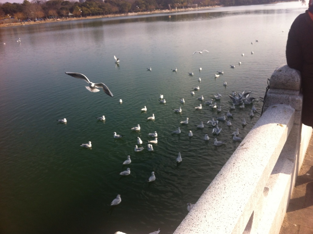それでもうちょっと遠くに視点をずらすと、橋から離れた人工池の淵あたりにのんびりと待機している奴らがいるんだよ。ここならわざわざ空中キャッチする必要はなく、運良けりゃ獲物にありつけるって感じ